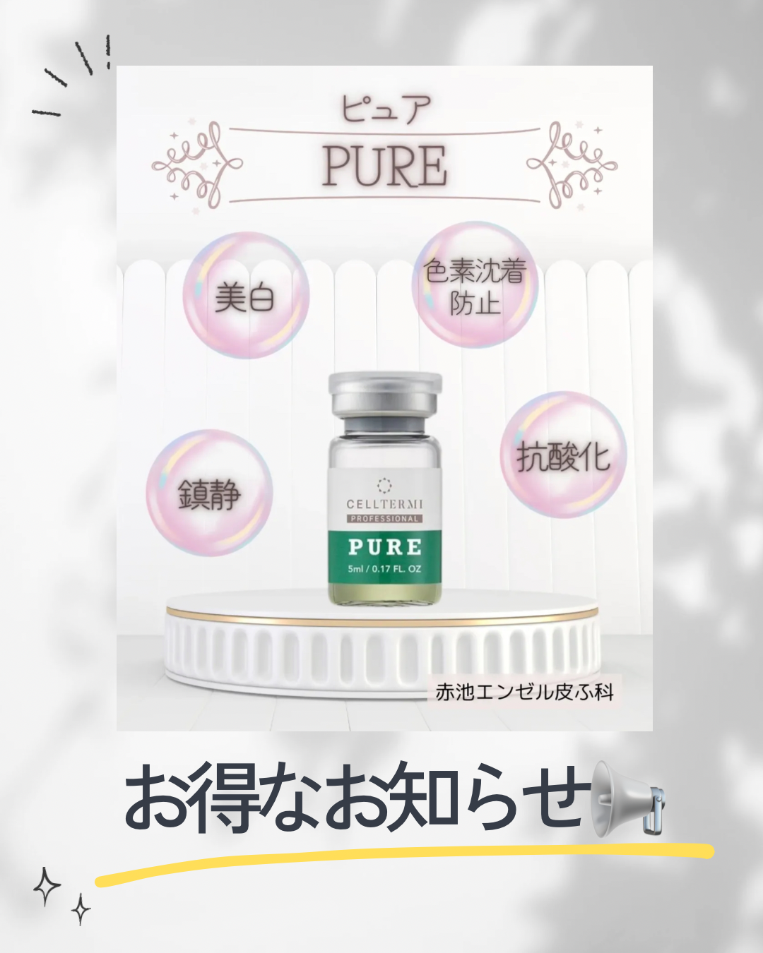 この度、R7.12月24日よりスキンアップルミ(超音波導入)の導入液 PURE製剤がメーカーの製造終了に伴い、5月末にサービスが終了するため、お値打ちに施術頂けます✨